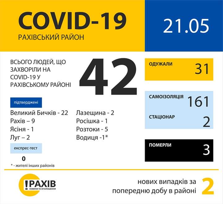 Ситуація щодо COVID-19 в Рахівському районі станом на 10 годину 21 травня 2020 року: – сорока двом мешканцям Рахівського району (смт. Великий Бичків – 22, м. Рахів – 9, смт. Ясіня – 1, с. Луг – 2, с. Лазещина – 2, с. Росішка – 1, с. Розтоки – 5) встановлено діагноз COVID-19, з них: 3-є померли, 1-н хворий знаходиться на стаціонарному лікуванні в обласному медичному закладі, 1-н знаходиться на стаціонарному лікуванні в КНП „Рахівська районна лікарня”, 6-ро з ознаками ГРВІ у задовільному стані на самоізоляції; – із 42…