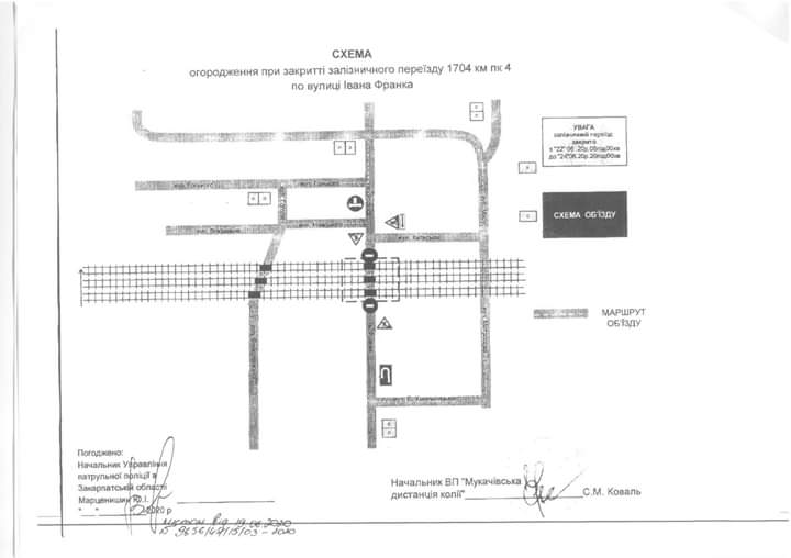 До уваги водіїв транспортних засобів Виробничий підрозділ “Мукачівська дистанція колії” повідомляє, що у зв’язку з виконанням графіка проведення ремонтних робіт, необхідних для забезпечення безпеки руху поїздів та автотранспортних засобів буде закрито переїзд для рух автотранспортних засобів, що перетинає вул. Франка Івана у м. Мукачево на період з 22 червня до 20:00 год. 24 червня Схема огородження при закритті залізничного переїзду додається.