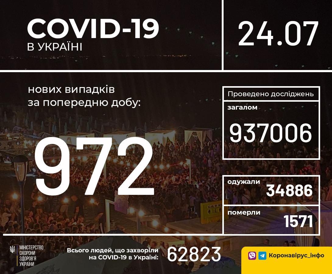 МОЗ повідомляє: В Україні зафіксовано 972 нові випадки коронавірусної хвороби COVID-19 24 липня (станом на 9:00) в Україні 62 823 лабораторно підтверджені випадки COVID-19, з них 1571 летальний, 34 886 пацієнтів одужало. За добу зафіксовано 972 нові випадки. Загалом проведено 937 006 тестувань методом ПЛР. Усього за добу одужало 886 пацієнтів. Наразі коронавірусна хвороба виявлена: Вінницька область — 2462 випадки; Волинська область — 3446 випадків; Дніпропетровська область — 1302 випадки; Донецька область — 830 випадків; Житомирська область — 1670 випадків; Закарпатська область — 4706 випадків; Запорізька область — 712 випадків;…