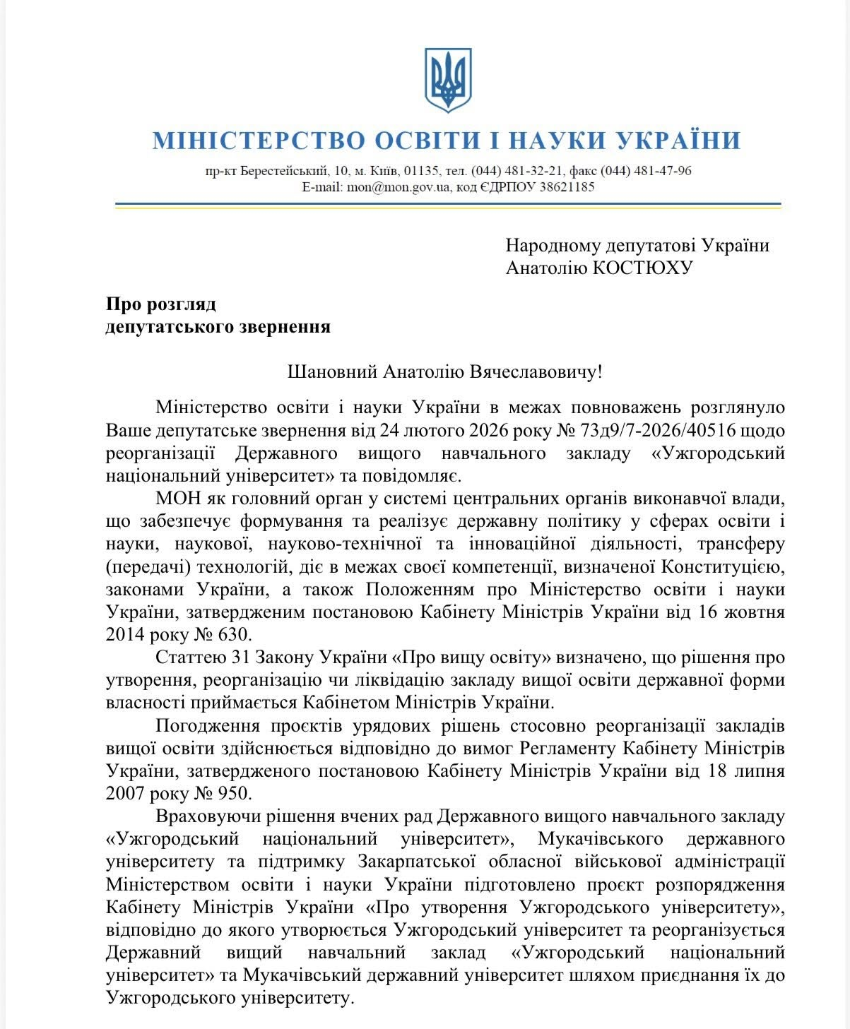 Народний депутат України Анатолій Костюх повідомив, що отримав відповідь від Міністерства освіти і науки України на своє депутатське звернення щодо можливого об’єднання Ужгородського національного університету та Мукачівського державного університету.