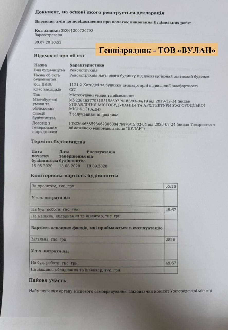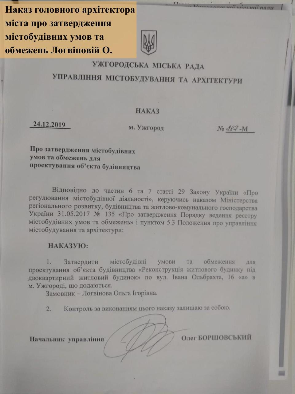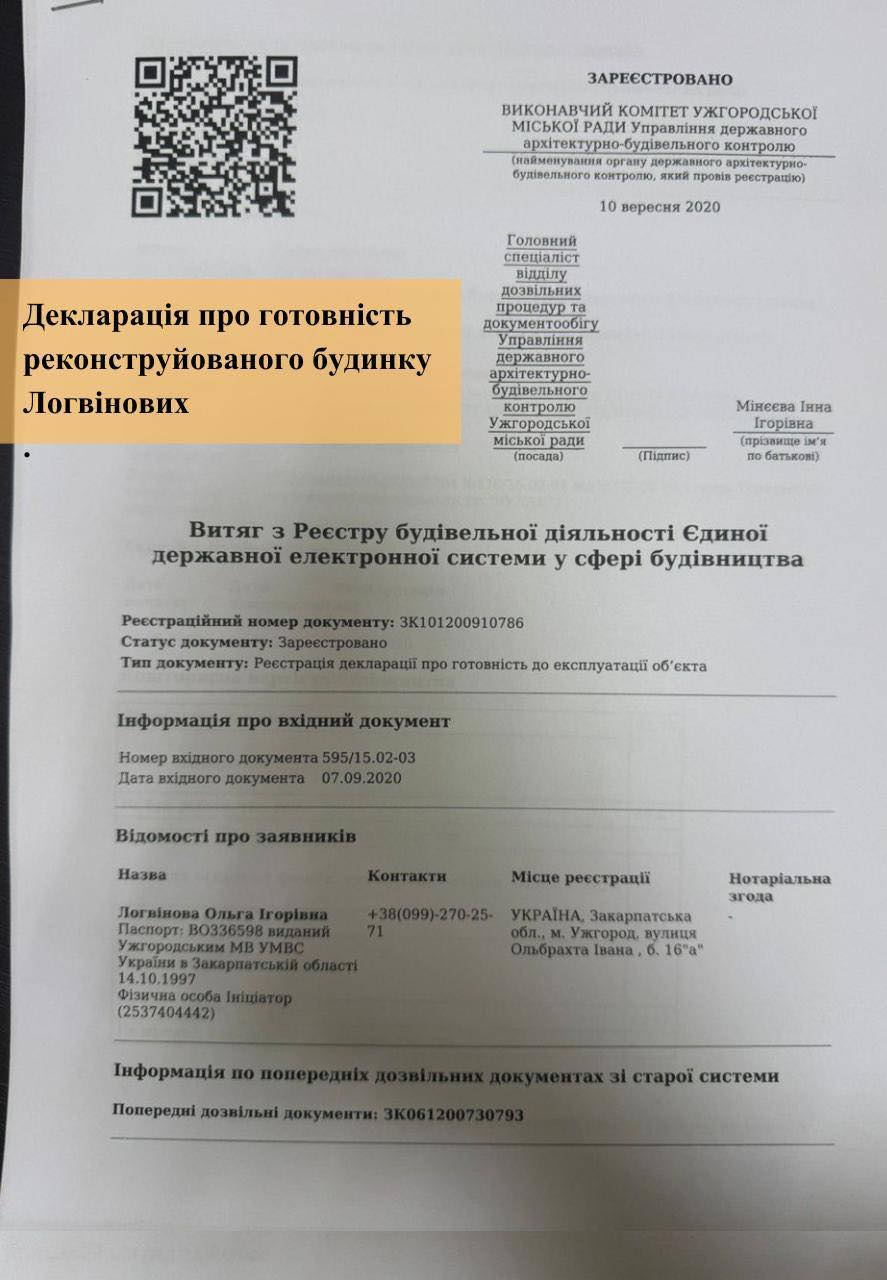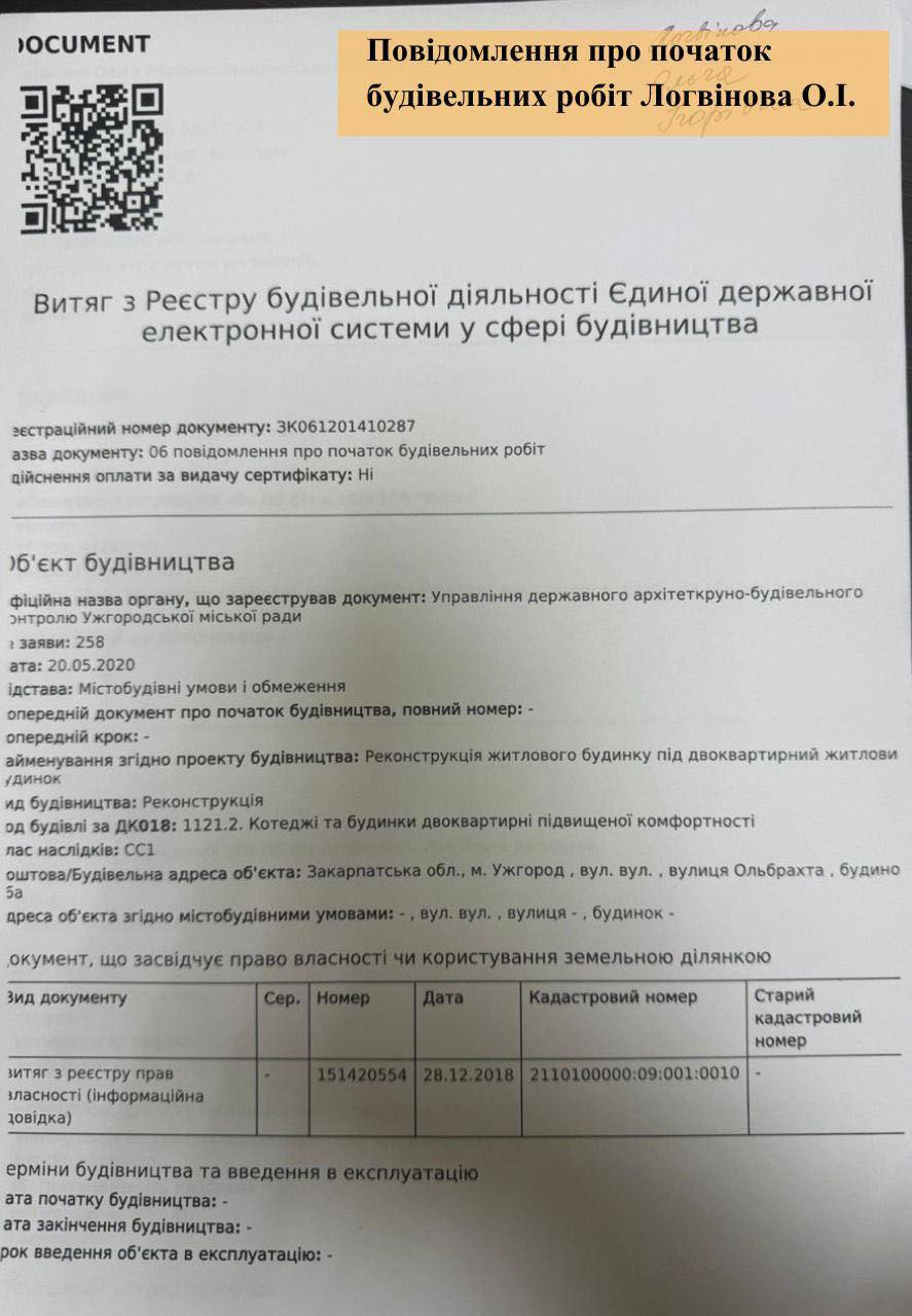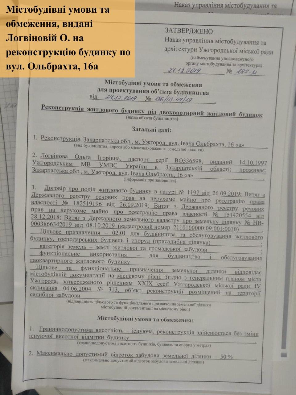 У заяві також наведено приклад реконструкції житлового будинку за адресою вул. Ольбрахта, 16а, який, за словами Волошина, належить родині Логвінових і розташований поблизу Ужгородського ботанічного саду. У публікації йдеться, що у 2019 році власниця будинку отримала містобудівні умови на реконструкцію житлового будинку під двоквартирний. Відповідний наказ був виданий управлінням містобудування та архітектури міської ради.