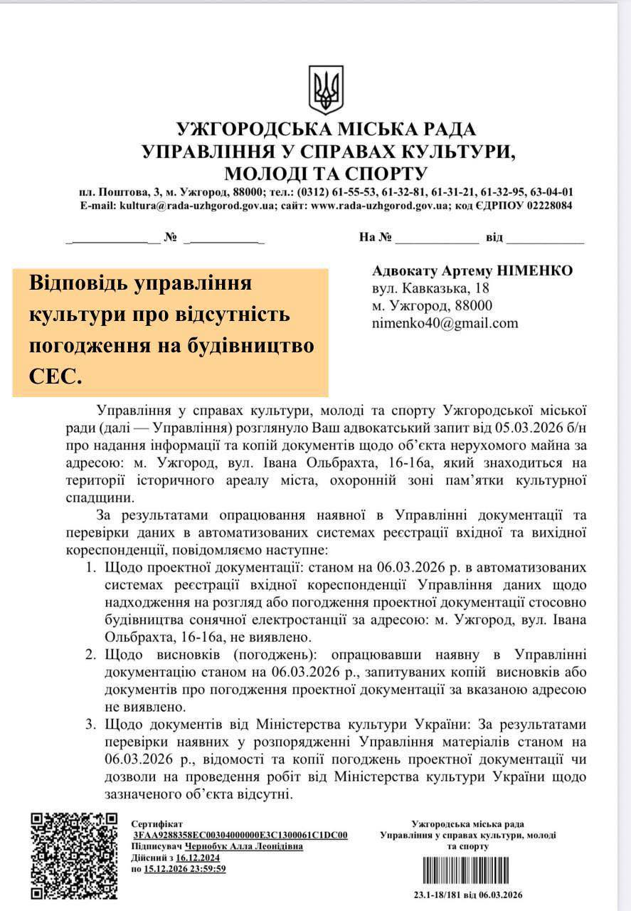 Іван Волошин також стверджує, що під час реконструкції на будівлі було встановлено сонячну електростанцію, однак необхідні погодження органів культурної спадщини, за його словами, відсутні. У відповідях на інформаційні запити, як зазначається, управління культури Ужгородської міської ради та департамент культури Закарпатської обласної військової адміністрації повідомили, що проєктна документація щодо цих робіт на погодження не подавалася, а дозволи Міністерства культури відсутні.